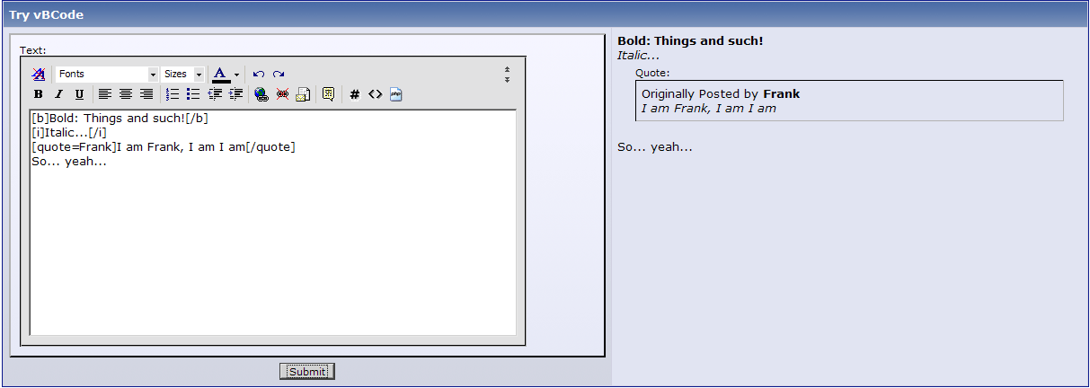 I've gotten grumpy a few times where someone will release a new vBCode and I want to test it in action before installing it, so I go to their board to try it... and find that they have no place to test out posting options. I can't much imagine what it'd be like for a new member at a forum where there's no place to test this stuff. So, I made this (because I couldn't find anything like it).