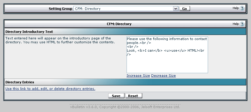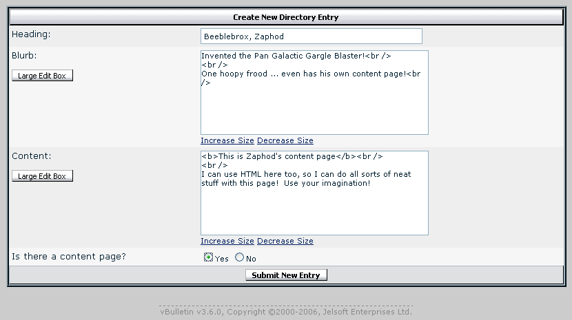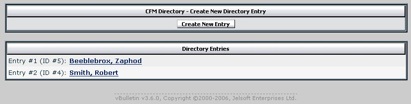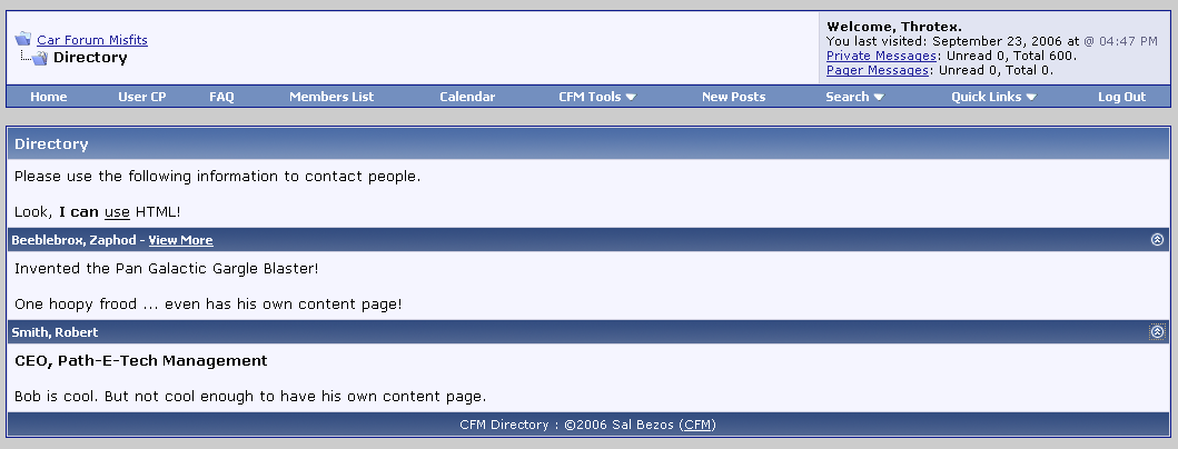 ------------------------------------------------- Author: Sal Bezos (email) Date of Creation: September 23, 2006 Version: 0.1 (9/23/2006) Home: http://www.carforummisfits.com/ ------------------------------------------------- Purpose: -------- This product for vBulletin creates a directory page for any sort of directory-type content. It uses collapsable rows in a table to present large amounts of data in a compact space. Items are added to the list via the AdminCP. Entry options include a heading, a blurb (shown under the heading when you expand the row), and a custom webpage with additional contents that may be optionally enabled for each directory entry. I designed this for my forum in order to provide a list of affiliated advertisers to my users. However, it can be used to compactly display many other types of information, such as contact information. Since support is limited, I encourage you to modify this for your own uses (and release any derivative works on vbulletin.org) provided you provide an attribution to me. Tested: ------- This product has been tested on a modified vBulletin 3.6.0 installation. There is no reason why it should not work in the same manner on any 3.5.x installation, but it has not and will not be tested by the author. Included Files: --------------- - README.txt - cfmdirectory.php - admincfmdirectory.php - product-cfmdirectory.xml - sshot1.png - sshot2.png - sshot3.png - sshot4.png - sshot5.png - sshot6.png Installation: ------------- 1. Upload the admincfmdirectory.php file to your admincp directory, and set proper file permissions. 2. Upload the cfmdirectory.php file to your forum root directory. 3. In your admin panel, go to Plugins & Products / Manage Products / Add/Import Product and import the "product-cfmdirectory.xml" product file. If this is your first installation of this product, select the "No" radio button in the "Allow Overwrite" option. If you are upgrading or reinstalling, select the "Yes" radio button. Click the "Import" button. 4. Visit http://<yourhostname>/forums/cfmdirectory.php to verify that the page appears. Now you're ready to add items to the directory. 5. In your admin panel, go to vBulletin Options and select the "CFM: Directory" options from the list. 6. You may choose to enter text in the Directory Introductory Text box. You can use HTML here. This text will appear above the text of your directory. Click the Save button if you want to save any changes. 7. Click the Directory Entries link. 8. Click on Create New Entry 9. Enter a heading for your directory item, and a blurb (HTML is allowed). The blurb will appear when you expand the directory item. 10. Optionally, enter something in the content block. This will appear on its own page, kind of like a personal web page for the item you are adding. If you want to use this, be sure to set the content page radio button to "Yes". 11. Click on Submit New Entry. 12. Revisit http://<yourhostname>/forums/cfmdirectory.php to ensure that the item appears as expected. 13. Lather, rinse, and repeat. 14. Add a link to http://<yourhostname>/forums/cfmdirectory.php somewhere on your forum so your users can access it ... maybe in a pretty drop-down menu of your choice. I won't impose the location on you -- I think you can handle this! FAQ: ---- Q: I hate the names of things! A: That's not really a question. Q: I hate the names of things? A: Uh, better ... I tried to put things in phrases. Also, you can always go dumpster-diving in the templates and php files for anything I left out. Don't be afraid, there's not much you can hurt. Q: Can you explain your screenshots? A: I suppose ... sshot1: AdminCP option menu w/ Intro text box and link to directory manager sshot2: Entering data ... this entry has a content page sshot3: After adding two entries. Entries are sorted alphabetically by heading sshot4: The directory in its natural state -- all entries collapsed. Notice Zaphod has a personal page. sshot5: The directory with both entries un-collapsed sshot6: A content page Support: -------- Any questions and problems should be reported to the modification's thread on http://www.vbulletin.org and may or may not be answered. No warranty, express or implied, is granted with this software. Use is at your own risk. License: -------- GNU GENERAL PUBLIC LICENSE Version 2, June 1991 Live demo: http://www.carforummisfits.com/forums/cfmdirectory.php (my personal install will be updated with ads when I get to it) Download