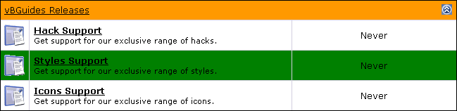 Brought to you by: http://www.vbguides.co.uk ----------------------------------------------------------------- SERVICES | HACKS | STYLES | VIDEO GUIDES | PROFESSIONAL SUPPORT ----------------------------------------------------------------- What does this hack do? This hack allows you to change the background colour of each forum / category to whatever you assign. Planned New Features Image Support Font Colour Hack Installation Template Edits: 2 Products: 1 Credits: Matt Hutchings (TrueDeath) - Creator -=DCG=- - Idea Support: Support can be given in this thread, or on http://www.vbguides.co.uk/index.php?t=4 Don't forget to click INSTALL If you like this creation and wish to support further creations feel free to donate to: Download