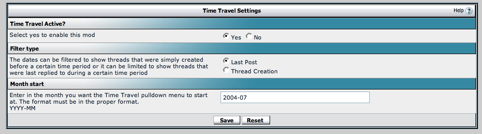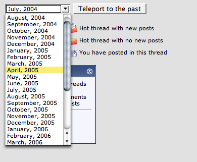 $pagenav = construct_page_nav($pagenumber, $perpage, $totalthreads, 'forumdisplay.php?' . $vbulletin->session->vars['sessionurl'] . "f=$forumid$hook_pagenav", "" 4. Go to vBulletin Options -> Time Travel Settings 5. Adjust the settings to suit your forum 6. Test the mod on your forum 7. Report back here with any comments/feedback 8. Finished ------------- changelog: 0.1 - initial release 0.1.1 - bug fix 0.2 - filter out stickies - use vBulletin Options area to enable/disable mod, set start month, choice between filtering by last post or thread creation date, set default to filter by last post ------------- Download