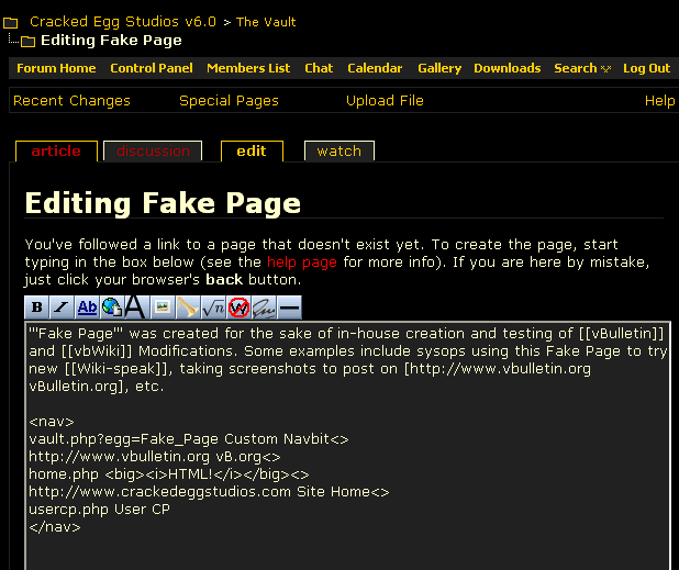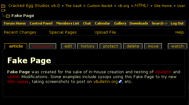 Version: 1.0.0 Requires http://www.nuhit.com 0.9.7 RC1 or later *** This extension is no longer supported. My other hack CES Custom Navbits on Any Pages now includes these features without using the convoluted code this does. *** vbWiki Pro is a commercial product available at http://www.nuhit.com. vbWiki Pro integrates MediaWiki 1.6.8+ and vBulletin 3.6.x. NuHit also offers a free version of vbWiki with only User/Login Integration. Now back to this hack... What It Does: Allows an editor to specify a breadcrumb path for the vBulletin navbar that's more specific than simply: Wiki > Article Since Articles can be contained in multiple categories on the same level, an automated system did not seem to be the best route. This system also enables a breadcrumb to link to other pages on your site other than a Wiki Category or another Article. Products to Install: 1 Plugins Included: 1 Files to Upload: 3 Template Edits: 0 Files to Edit: 2 Queries Added: 0 Hooks Added: 1 Features in Version 1.0.0: - Use <nav>...</nav> wikispeak to add navbits between Wiki and Article - Use <> to add even more custom bits - Supports relative and absolute links - Breadcrumb can use any custom text - Supports HTML in Breadcrumb-text - Wiki level uses $wgSitename (it will say the wiki's title, rather than 'Wiki') - Navbits immediately updated Well, you can't really have too many features in a navbits extension. :knockedout: Syntax: Code: