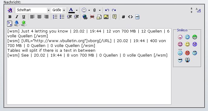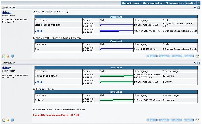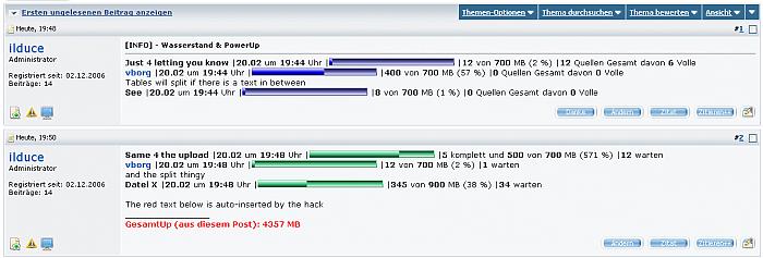 [sids - Wasserstand] Wasser-what? Well, Wasserstand means 'stage' or 'water-level' and in this case it is a visualizer for download or upload progress So if you use any peer2peer system for spreading your work, you can show how much you already gave and your users can let you know how much they already got. All you have to do is click on that green or blue arrowed editor-button and answer the questions that'll be asked. And you will have something like this ![]() If you don't have enough space for another two editor-buttons maybe Editorbutton Newliner can help you out ![]()