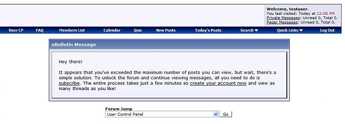 Welcome headers - Improve community registration rates Limited Guest Viewing -- Improve community registration rates With vBulletin, registered users are able to view endless amounts of content without being directly asked or forced to subscribe no matter how many times they come back. The purpose of the Limited Group Viewing System is to drive in subscriptions by limiting the number of threads registered users are able to view without interruption. This plugin offers two options which can be used to drive in more subscriptions. The first option allows you to show a reminder message or advertisement after a guest has viewed a certain number of threads. The second option puts up a roadblock stopping registered users from viewing threads altogether after reaching a certain number of views. Both options work together to encourage and ultimately force registered users to either subscribe and pay or login but can also be used separately based on your individual needs. Because this plugin uses cookies, few if any bots will be impacted when it comes to spidering your site. Modifications/ Instructions: Template edits: 1 Plugins: 1 (adds 1 template and several settings) This template hack should take under 5 minutes to implement and customize. Customizing the content / messages To customize which messages appear or what they say, go to vBulletin options, select the Limited Group Viewing System group and configure the options as desired. Each phase can be modified by adding translation text. Through the ACP you can enable or disable each option, specify the number of threads that can be viewed before the option is enabled and input any forums you wish to exclude from being blocked. About spiders/bots This plugin works by setting a cookie to track the number of visits from a particular user. As bots do not tend to accept cookies, they should not be blocked. To further insure there is no spider accessibility issues, there script identifies major bots (google, yahoo, msn, aol) and explicitly lets them through -- you can easily add to this list by editing the plugin code should you so desire, however, unless a bot starts taking cookies this should not be necessary. Welcome headers compatibility The Limited Group Viewing is designed to work with the Welcome Headers system and limited guest viewing without any conflict. To insure that welcome header messages do not show up at the same time as the limited guest viewing message, please be sure you are running welcome headers version 4.1.3 or greater (released 11/19). This script was Modified from the original limited guest viewing originally created by TedS! Default is set up for registered users: usergroup #2. Download