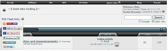 This code is for a drop down menu coded for "RSS Feed Links" in the navbar with it's own navbar cell and a search box with radio buttons with the choose of Google and your own site.