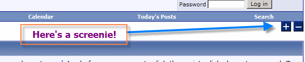This little mod puts a "+" and "-" image button beneath and aligned to the right of the navbar for resizing the font. Time: 1 min Template edits:1 Plugins: 1 Version 1.0.1: Add $font_resize where you want the buttons to appear. Requested Spoiler (click to open)
