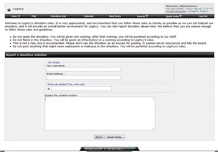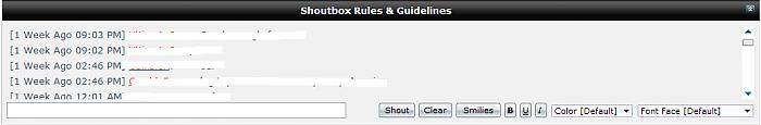 of violations. They were complaining about the rules not being posted. Well, whalaa! Here they are! A very simple shoutbox rule page! Features: Display your shoutbox's rules. Ability for users to report violations using the contact.php. Reported violations will be sent to the webmasters predefined email. Guests cannot report violations. Installation: Download the zip package and refer to the install.txt Support will only be given in this thread to users who clicked install. On the subject, if you use this, PLEASE CLICK INSTALL! Download