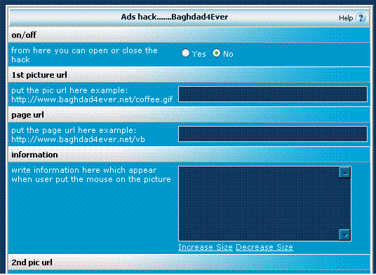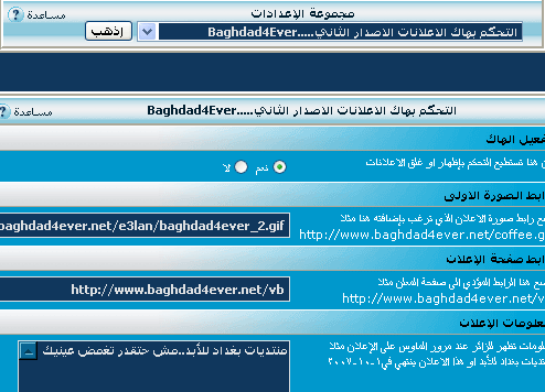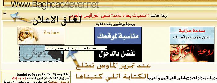 by this hack you can manage and add your ads to the forum very easily installation:- -template edit: 0 -file upload : 0 - import product only time of installation : 1 minute 1-upload the pictures to images folder baghdad4ever.gif baghdad4ever_collapsed.gif ie: http://www.xxx.com/vb/images/baghdad4ever_collapsed.gif http://www.xxx.com/vb/images/baghdad4ever.gif 2- Import XML file (as product): AdminCP > Plugin System > Manage Products > [Add/Import Product]. 3-To set options: Go to: AdminCP > vBulletin Options >ads........Baghdad4ever you must enable the hack to be work. done. features: 1-enable/disable the hack. 2-the color of ads box take the color of style automatically. 3-any table without pic ,doesnt appear. 4-ads box collapsable. plz if you install it ,dont forget to " thanks Download