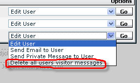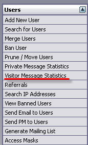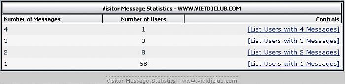 Visitor Message Statistics This hack lets you view an index of all user's visitor message on one page. Looks like a Private Message Statistics. ENJOY! Installation: 1. Upload "visitor_mes_stats.php" to your admincp folder 2. Upload "cpnav_visitorMes.xml" to your includes/xml folder. 3. Languages & Phrases --> Phrase Manager --> Add New Phrase Phrase Type: GLOBAL Product:vBulletin Varname: delete_all_users_visitor_messages Text: Delete all users visitor messages all done Usage: On your admin control panel, under the "User" menu theres a link to the Visitor Message Statistics mod. Only Administrators can use it. MAKE SURE YOU CLICK ! Download
