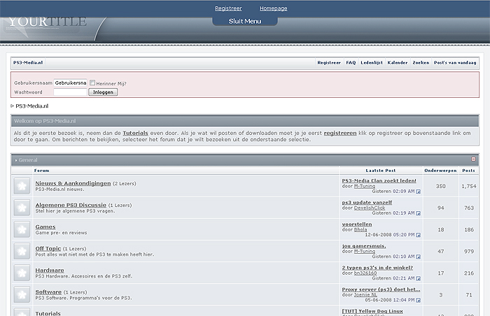 I wanted a nice dropdown menu with a login form and if you have logged in there are QuickLinks. I used http://www.mootools.net/ for it, works really good. All texts are phrased, so when you install it it's in the language of your board. Just download and install if you like it ![]() Demo: Here's a demo for you of how it works: http://www.psp-media.nl/demo/demo.htm Installation: 1. Download &stc=1&d=1212052802 and upload the tab file in your forum directory. 2. In the headinclude template find Code: