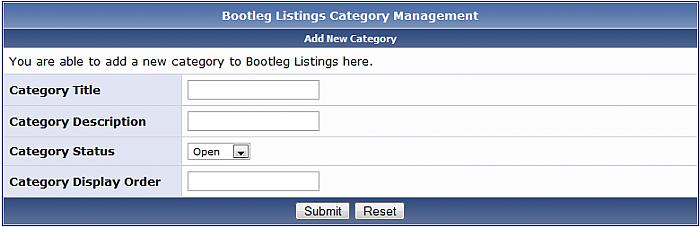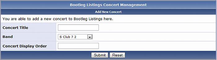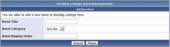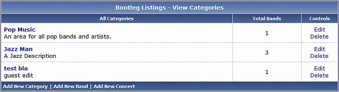 This is a re-make of Wolfe's Modification here. I have kept things simple for now, i'm looking for suggestions for new fields, rather than adding a load of unneeded one's I thought i'd see what you wanted. Bootleg Listings is a system made for vBulletin. It allows you to add categories, within these categories you are able to add bands/artists. Then within these bands/artists you are able to add their concerts. Members are able to comment on both bands and their concerts. Categories, Bands and Concerts can all be added via the AdminCP or via the front end by anyone with the correct Usergroup Permissions. Visit PaulSonny for news, demos, screenshots, and more! Demo: http://www.paulsonny.com/forum/bootleg_listings.php If you have any feature requests please make them known at PaulSonny. Installation Instructions [] Upload all the files from the Upload folder. [] Import product-bootleg.xml via the AdminCP Product Manager. [] Set Permissions for each usergroup via the AdminCP for Bootleg Listings. [] Set Categories, Bands and Concerts up for Bootleg Listings. All, and further instructions are included in the readme file. Please remember to click if you use this modification. If you use this plug-in, and find it useful, please support us by nominating us for Mod Of The Month (MOTM) in the top right corner of this thread, or feel free to donate. You will get an email when a new version is released. Thanks, PaulSonny. Download