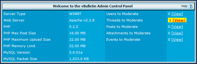 What does it do? This modification highlights the like to moderated items if there are any in the queue, on the Admin Control panel home page. Technicalities This mod adds one plugin which adds some Javascript to the ACP index page which highlights the links if necessary. Installation Import the XML file Compatibility Tested in Firefox 3 and IE 7 on vBulletin 3.7.2. It will probably work in other versions/browsers as well. Screenshot ![]() Download