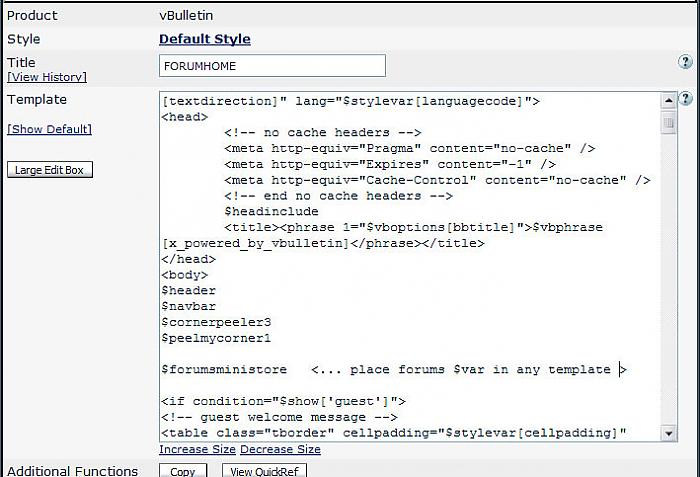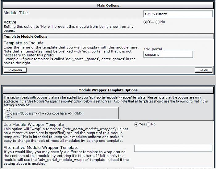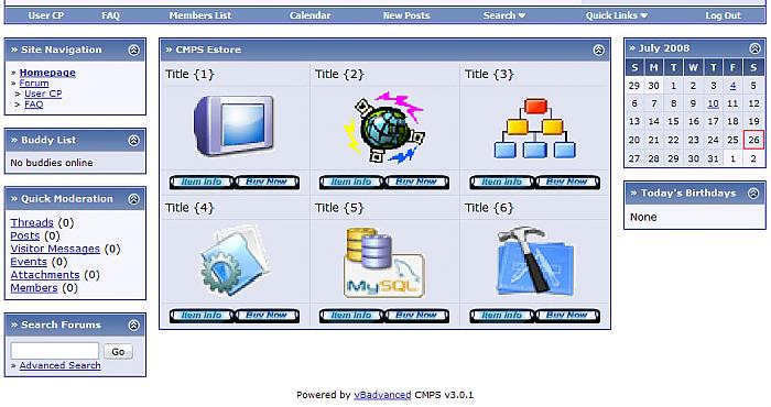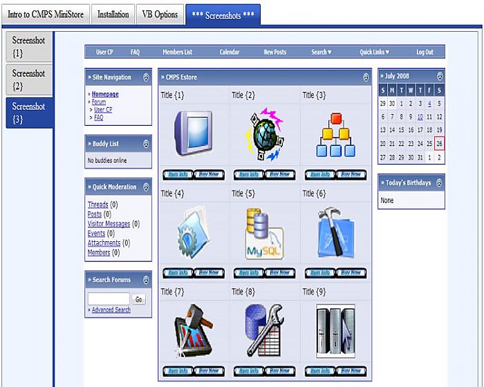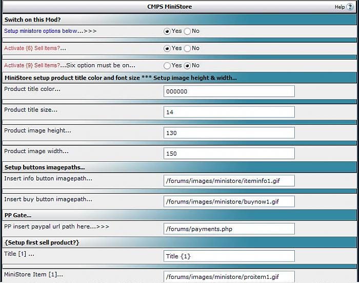 ****************************** Exactly What does this mod do U say? It allows admins to use simple options to add sell items to CMPS & Forums templates... I put this mod together because I couldn't find a satisfactory Estore format that would easily integrate with vbulletin... Therefore I stubbled upon this mini-mod solution for now... Getting Started ************ {1} Download and View Tutorial...5min install... {2} Install plugin... {3} upload ministore images folder... Make sure the ftp forum-path is correct... {4} create new module, add name, add template <{ adv_portal_cmpsms }> and colspan 3... {5} goto vbsetting and find CMPS ministore... {6} Setup title font size, color and name... {7} Setup item pictures & Height/width, buttons, pay gate and info threads... ******************************************** Ver...>>> Forums Ministore 0.1.0 use $var to place into any template...>>> $forumsministore ******************************************** Ver...>>> Forums Ministore 0.1.1 edit image links turn on/off 5/10 items added 10th item added 5 items per row ******************************************** Ver...>>> Forums Ministore 0.1.2 added total 15 items added 5 items per row ******************************************** Ver...>>> Forums Ministore 0.1.3 turn on/off 5/10/15 items added better IE alignment added images width and height option ******************************************** Ver...>>> Forums Ministore 0.1.3 to 0.1.5 Added five more items turn on/off 5/10/15/20 items Cleaned up code to 100% ******************************************** +++++++++++++++++++++++++++++++++++++++ ******************************************** Ver...>>> CMPS Ministore 0.1.0 edit image links turn on/off 3/6/9 added 9 items added 3 items per row ******************************************** Ver...>>> CMPS Ministore 0.1.1 turn on/off 3/6/9/12/15 added 15th items * 3 items per row added IE alignment added images width and height option ******************************************** Ver...>>> CMPS Ministore 0.1.1 to 0.1.3 Added Six more items turn on/off 3/6/9/12/15/18/21 Cleaned up code to 100% Total Package *********** {1} images folder {1} template {1} xml file {1} tutorial *********************************************** This mod works with your Paypal subscriptions / usergroups ***********************************************