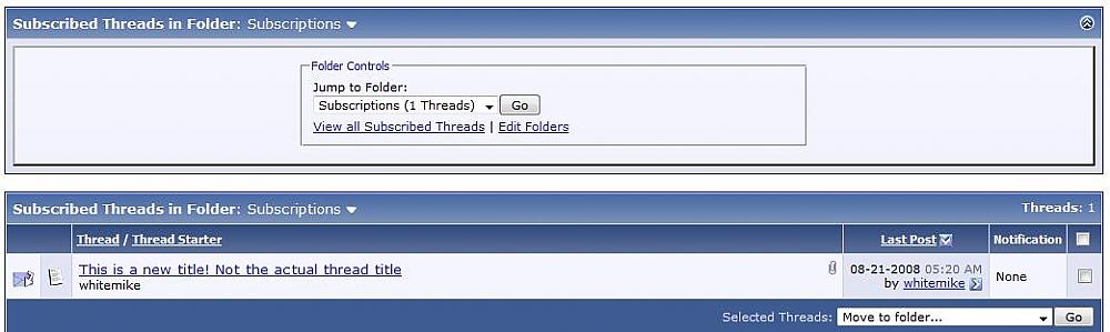 Thread Subscription Title by: Michael Biddle http://www.white-projects.com What does this do? One one of my forums that I am at, I subscribe to quite a bit of threads for bug fixes. When I subscribe, it will only use the thread title, which does not help me out if it is not specific to the issue. So I made a little modification that will allow you to define what you want the title to be for the thread subscriptions. If you choose not to enter anything inside of the title box, then it will just use the thread title. How do I install it? 1. Upload the product to your vBulletin Product Manager 2. Download and open your subscription.php Find: PHP Code: