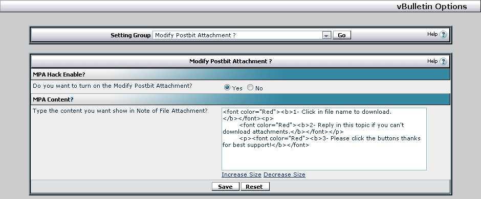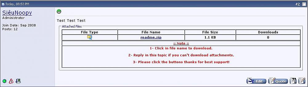 SN - A new Postbit Attachment Description: This MOD Make A New Postbit Attachment. Features: - On/Off Hack? -Content of Noted in Attachment. How to install? ACP >> Plugins & Products >> Add/Import Product and upload the XML you downloaded. And you are done ![]() Version History: 02 Oct 2008: 3.7.001 - First released. ***** Please click to Install if you like this hack ***** Download