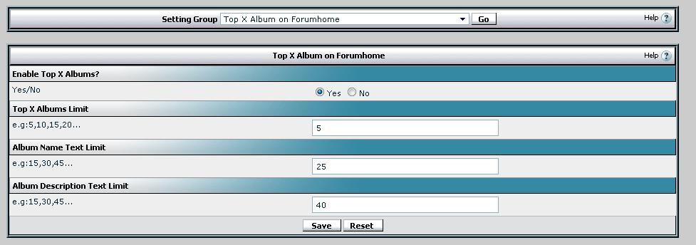 What Does it?:This hack will add to your FORUMHOME Top X Album. Install: +Go to admin Cp +Plugin System -> Manage Products -> [Add/Import Product] -> Select +'product-top_x_album_on_forumhome.xml' then İmport. +and Add anywhere on Forumhome "$xalbum" Settings: vBulletin Options->Top X Album on Forumhome Download