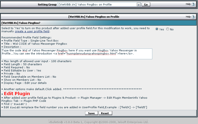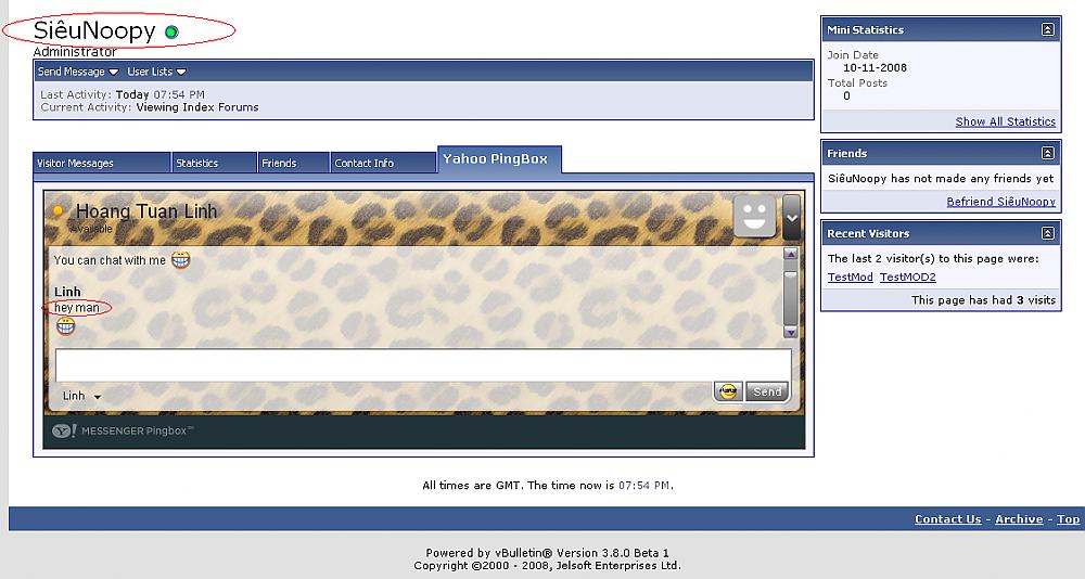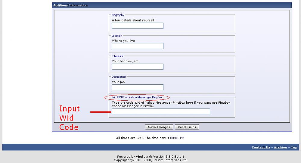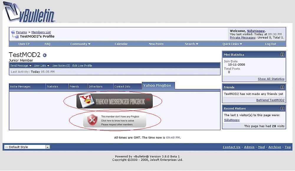 [SN] Memberinfo Yahoo PingBox Tab About : This MOD is coded because this post [REQ] MOD here. First MOD for vBulletin 3.8.0 Beta 1 and 3.7.x ![]() Description: This MOD will added the Memberinfo Yahoo PingBox Chat in profile page and utilise service Yahoo ,no need large bandidwth. Version : MOD [SN] Memberinfo Yahoo PingBox Tab version 3.7.001 tested with vBulletin Verison 3.8.0 Beta 1.But no problem with vBulletin version 3.7.x Functions: - Turn On/Off - User chat using service PingBox - Using Service PingBox no need large bandwidth. - User can use or no using. Install View file install_english.html in folder install. Options : ACP >> vBulletin Options >> Options [SN] Memberinfo Yahoo PingBox Tab.. Updated : v3.7.002.Fixed error the width in styles fixed v3.7.003.Added Image Logo PingBox and Introduction.See the last imae DEMO below,in attachment. Mark As Installed, if you use this MOD. Download