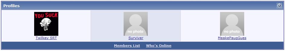 A site I work on was using Zoints and with that, used the forumhome random profile feature. Well there were way to many problems with Zoints for me to even consider keeping it, but the owner of the forum liked the random profile feature, so I told him I would make one for the default vB profiles. So I did and figured I would release it here sense I couldn't find this mod on here anywhere. What does it do? This mod allows the admin to display a horizontal table on the forumhome, that displays a number of boxes, which the admin chooses, that contains a users name that is linked to their profile and their avatar scaled down to make the box look organized. What can the admins do? The admins can enable or disable the mod. The admins can choose to list the users based on one of a couple things.