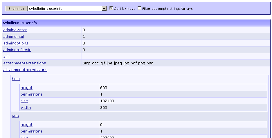 Global Array Examiner is a tool that assists vBulletin developers by exposing the contents of global arrays like $_SERVER, $_COOKIE, $vbulletin->userinfo etc using a nice table representation. To install, simply upload the attached gae.php to your vbulletin directory. To use it, simply call the file from your web browser, for example http://www.yoursite.net/forum/gae.php. Then use the dropdown to examine the global array you want. To uninstall, simply delete the file from your server. Really, this php file does not modify your database or vbulletin settings in any way. So far, GAE exposes the following global arrays: