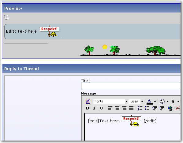 All thanks go to them , I just make it work on vBulletin. http://www.pijanitvor.com/forum If you like it, click install and say Thanks This BBcode is good when you or moderator must edit some user post! Title: Edit Tag: edit Replacement: Code: