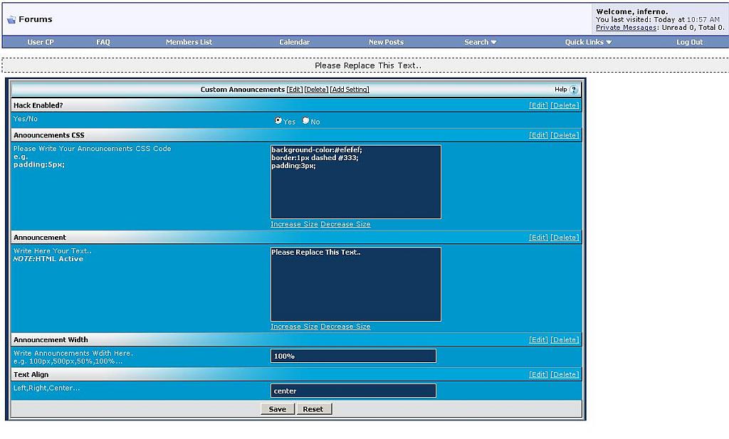 What Does it?:This hack will add to FORUMHOME your announcements .Install: +Go to admin Cp +Plugin System -> Manage Products -> [Add/Import Product] -> Select +'product-ca.xml' then İmport. +Go to vBulletin options->Custom Announcements Settings Find FORUMHOME; Code: