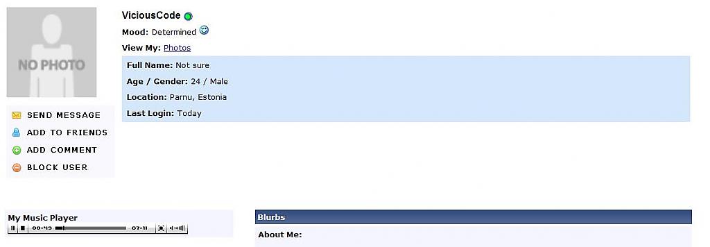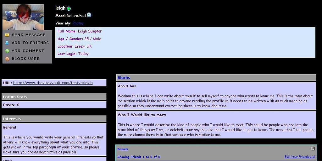 This will change your profile page to have a myspace style layout. This also uses standard css classes so should fit into any skin. It should squeeze down to 800x600 (just) and stops expanding around 1000 wide so it doesn't look too warped. We suggest setting everyone's profile pictures to 150x150 exactly for this to show up correctly and as intended. INSTALLATION INSTRUCTIONS 1- Upload .htaccess to forum root dir 2 - Upload the images to /images folder keeping their respective directories 3 - Upload the other files to the forum root 4 - Install product 5 - Create profile fields (as below) PROFILE FIELDS Full Name - Field 1 - TEXT FIELD County - Field 7 - TEXT FIELD OR SINGLE SELECTION MENU Country - Field 8 - TEXT FIELD OR SINGLE SELECTION MENU General Interests - Field 9 - TEXT AREA Marital Status - Field 10 - TEXT FIELD Height - Field 11 - TEXT FIELD OR SINGLE SELECTION MENU Zodiac Sign - Field 12 - TEXT FIELD OR SINGLE SELECTION MENU About Me - Field 13 - TEXT AREA Who I'd Like To Meet - Field 14 - TEXT AREA Music - Field 15 - TEXT AREA Movies - Field 16 - TEXT AREA Television - Field 17 - TEXT AREA Books - Field 18 - TEXT AREA Heroes - Field 19 - TEXT AREA Weight - Field 20 - TEXT FIELD OR SINGLE SELECTION MENU Drink - Field 21 - TEXT FIELD OR SINGLE SELECTION MENU Smoke - Field 22 - TEXT FIELD OR SINGLE SELECTION MENU contact Box Changer - Field 23 - TEXT FIELD Mood - Field 24 (see below for options) - SINGLE SELECTION MENU Music - Field 25 - TEXT AREA OPTIONS FOR MOOD PROFILE FIELD (please note, these must be copied as is, otherwise mood code in profile will not work) Fantastic Awesome Silly Witty Charming Happy Angry Sad Upset Determined Confused INFORMATION This MySpace profile addon is the updated version to my original release here. If you have installed this other one, then please uninstall and install this one in its place. FAQ. Does this work with vBulletin 3.8? I don't see why not, although this is untested. If someone tests, please report back to me with an answer What template does this modify? This modifies the MEMBERINFO template Not all the fields show up. Please check the field ID numbers. If you changed any of them, make sure you change them in the template too. Do you have a working demo? The only demo I have is on my test board, which as per the licence agreement is unaccessible to the public. If someone can install this and give me the URL, I will update this post with their board URL Any plans for a facebook one? We shall see. I am still in 2 minds whether I would like to do a facebook one or stick to MySpace Please remember to mark as installed and feel free to nominate us for MOTM. If you have any ideas for future releases, please post them below and I will look into adding them. This modification also comes with a flash music player for your users to play music on their profiles ![]() Download