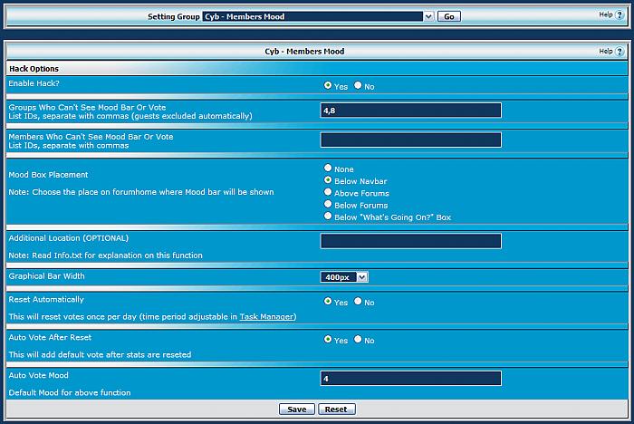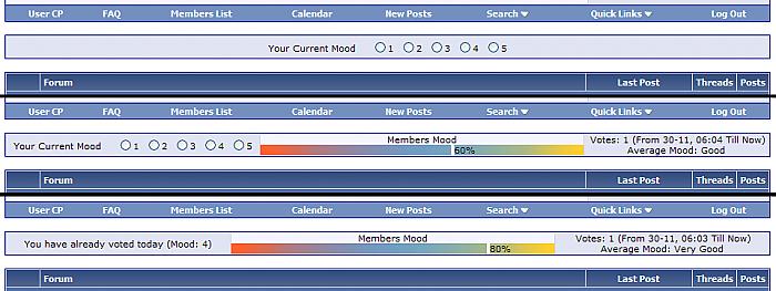 This will show membership mood for current day. Members can vote for one of five options (mood 1-5) once a day. Total votes/average mood are shown in stats. Total votes are also shown in percents using graphical bar. Votes are automatically reseted every midnight. You can change time period in Scheduled Task Manager. You can enable adding of default vote automatically after reset. SuperAdmins can reset stats/votes manually and see log. You can ban usergroups and individual members from voting and seeing mood bar. Installation: 1. Upload folder "cyb_vmood" to your forum root, then CHMOD "cyb_vmood_votes.csv" to "777". 2. Upload "cvm_reset.php" to \includes\cron folder. 3. Import XML file (as product): AdminCP > Plugin System > Manage Products > [Add/Import Product] To set options: Go to: AdminCP > vBulletin Options > Cyb - Members Mood To put it on different page: -You can have Mood bar shown on 2 pages It's shown by default on forumhome (to disable it set option "Mood Box Placement" to "None") To activate second location: a) type location-name in "Additional Location" field Explanation: When you open some vBulletin php file you'll see this at the top - "define('THIS_SCRIPT', 'XXX');" XXX is location-name we need. It's usually the same as php filename (without extension, of course) b) add "$cyb_vmood" to the template called on page where you wish to have stats shown Versions: v1.0 - Nov 27. 2006. -Initial Release v1.1 - Nov 30. 2006. -Changed hack name to 'Cyb - Members Mood' -Now only members can vote -Now each member can vote only once a day (you can change time period in Scheduled Task Manager) -Added two more options for voting, removed icons and changed options to numbers (1-5) -If user has voted already then 'you've already voted...' message and vote info is shown instead of vote options -Added option to view log in popup window (included info: time of voting, userid, userip, mood) - SuperAdmins only -Added option to ban individual members from seeing Mood bar and voting -Some small improvements in code v1.2 - Dec 01. 2006. -Fixed bug (stats wrong because of bug in vote status check code) -Added Auto-Vote option (this will add default vote after stats are reseted) -Added options to enable/disable Auto-Vote and define default mood v1.3 - Dec 01. 2006. -Fixed bug (wrong "your mood" info) -Added username info to log v1.4 - Jul 23. 2007. -Logs enabled for cron job -Improved way of reseting votes -Security exploit fixed v1.5 - May 03. 2008. -Compatible with vBulletin 3.7 -Minor bugs fixed Click INSTALL if you like this hack. Download