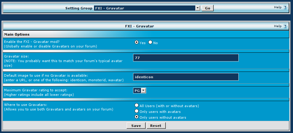This mod will replace user avatars for showthread.php, showpost.php, member.php, and memberlist.php with Gravatars (Globally Available Avatars). You can learn more about Gravatars at http://www.gravatar.com Installation: 1. Just install the XML file via Add/Import Product, and you're set. 2. You can configure the maximum Gravatar rating, default image, and sizes via the AdminCP under "FXI - Gravatar". You can also set up which users you want the Gravatars to be used for - all users, only those with avatars, or only those without avatars. Uninstallation: 1. Just uninstall the product and you're done. Upgrading: 1. Just set "Allow Overwrite" to Yes and install as usual. Caveats: 1. This mod relies on automatic template edits to postbit (or postbit_legacy), memberinfo_block_ministats, and memberlist_resultsbit, so if you made heavy modifications to these areas, my changes might not take if it can't find the target code. 2. If you notice any areas where the "old" avatars are still in place and not being replaced by my mod - please let me know! Demo Site: http://forums.fxinstructor.com Change Log: 1.0 - 2009.02.20 (Initial Release) 1.1 - 2009.03.27 + Optionally replace avatars only for users with avatars1.2 - 2009.04.09 + Support for postbit_legacyEnjoy! Download