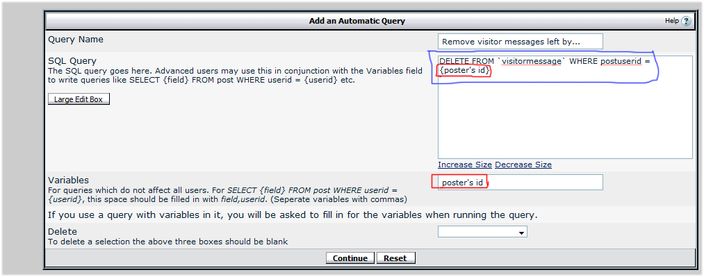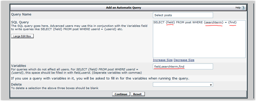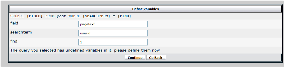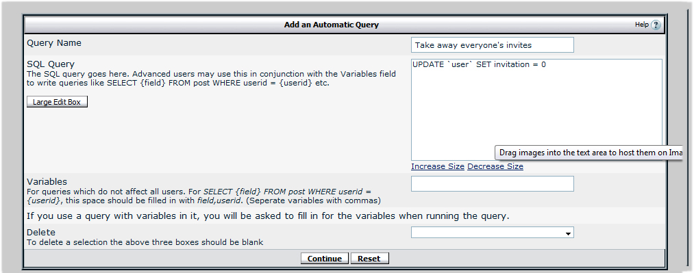 04/10/2009 (m/d/y) This mod allows you to store custom queries for later use. Simply define the query once, save it, and it'll appear under "Automatic Queries" in the Admin CP - allowing you to run it again in a matter of seconds. ::: CHANGE LOG ::: v1.0 - original release v2.0 - 4/12/09 -----New feature: Variables -----A few bug fixes v2.1 - 4/20/09 -----Saved queries can now be edited. ::: Installation ::: Extract product-my_queries.xml Upload product-my_queries.xml by going to ADMIN CP --> PLUGINS AND PRODUCTS --> MANAGE PRODUCTS --> ADD/IMPORT PRODUCT If you are upgrading then you should set "over-write" to yes. And you're done! http://creativecommons.org/licenses/by-sa/3.0/us/ As always with my releases, you are free to modify, distribute, derive work from, and translate this mod. If you liked this mod you might also like my others: Select Postbit [Select Postbit Shared Admin Notes [Shared Admin Notes Internal Forums Closed Message/Reason [Internal Forums Closed Message/Reason Auto-Moderate Evading Banned Members [Auto-Moderate Evading Banned Members (when they make new accounts) Multi-Quote / Edit Integration [Multi-Quote / Edit Integration Download