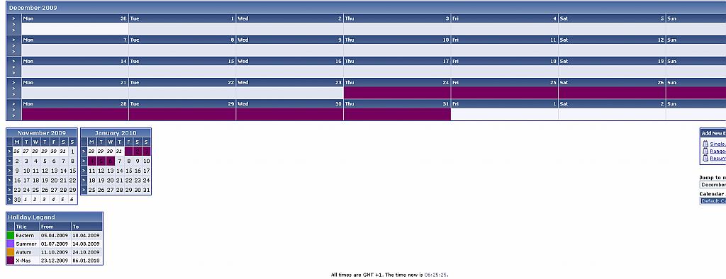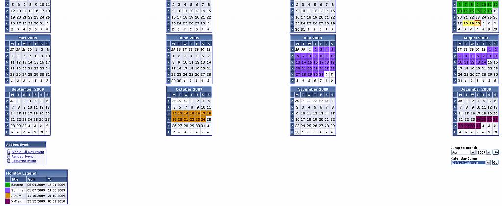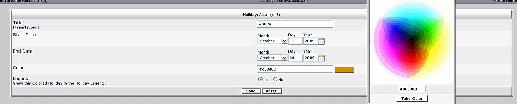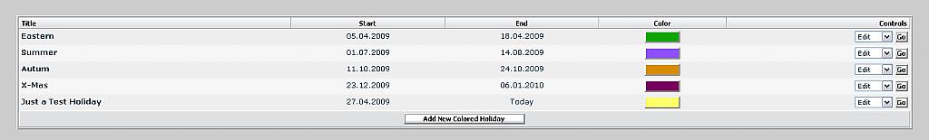 It will add an option in your AdminCP for creating "colored" Holidays. That means, you can enter a range of holiday and a color. This holidays will shown colored in the calendar (see images below). There is also a "Colored Holiday Legend". NOTE: If you overlap some days, the color of the last day will displayed in the calendar. Instructions: see READ.ME.html Support: Support is given - but you have to click installed ! NOTE: This Mod needs some code changes (sorry again - I hate it, too), but there are no HOOKs that I can use. Cheers Download