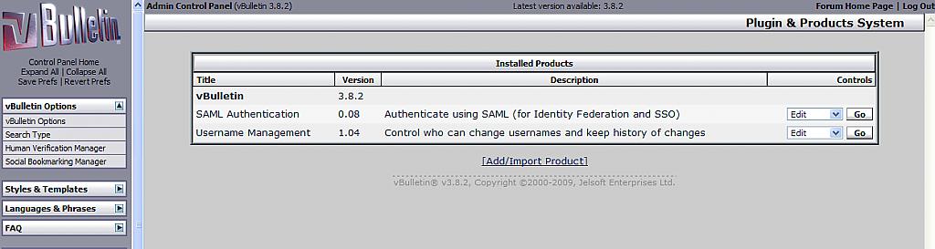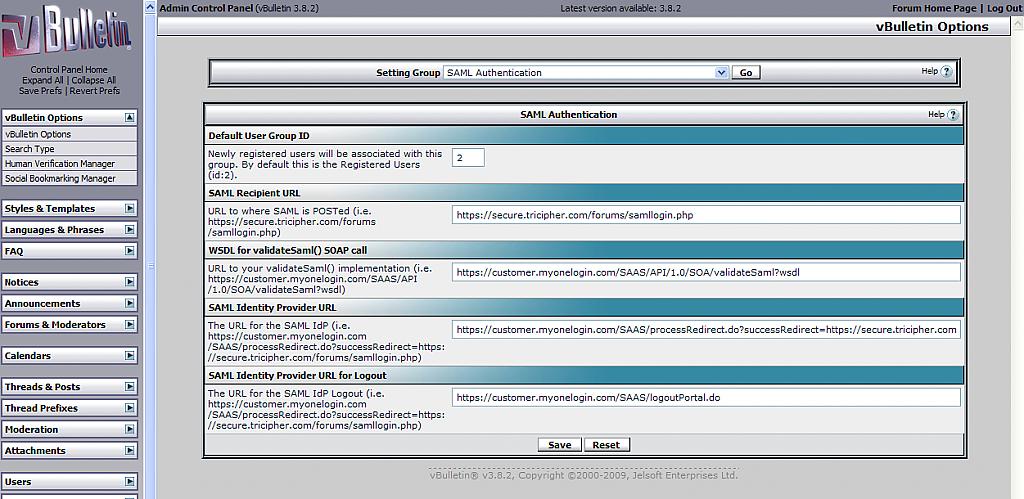 Version: 0.90, by kyle222 SAML Authentication Integration This add-on extends vBulletin to be able to consume SAML assertions from identity providers (IdPs). SAML (security assertion markup language) is a well defined XML-based OASIS standard for exchanging authentication information. It allows identity providers (IdPs) to authenticate users, then single sign-on on to multiple service providers (SPs). SAML is used by many Enterprises and has become the defacto standard for Enterprise authentication into SaaS applications (such as salesforce.com, Google Apps, WebEx, etc.). Benefits of SAML
