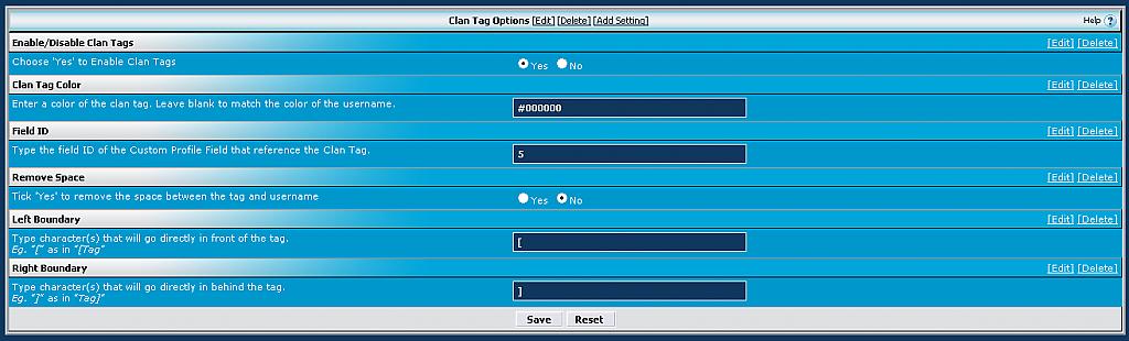 Install Instructions 1. Go to ACP 2. Expand "Plugins & Products" 3. Click "Manage Products" 4. Click "[Add/Import Product]" 5. Browse to "product-ah_clan_tags.xml" and import it. Setup Instructions Create a Custom Profile Field that you wish to be displayed beside usernames. Remember the number of the field ID and go into "Clan Tag Options" in "vBulletin Options". Type the number into the field labeled "Field ID". The Left and Right Boundary fields can be used to identify the tag. Instead of "Revharmor19" you can change it to "[Rev]harmor19" or any other character(s) you wish. Updates 1.1: Fixed the problem of another Custom Profile Field showing when you assign a color to the tags. 1.2: An option to either add or remove the space between the tag and username. You can add boundary boxes to make the tags easily recognizable. 1.3: Fixed issue with displaying of boundary boxes even if the user didn't enter any text into the field on their profile. Download
