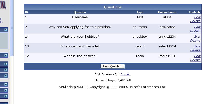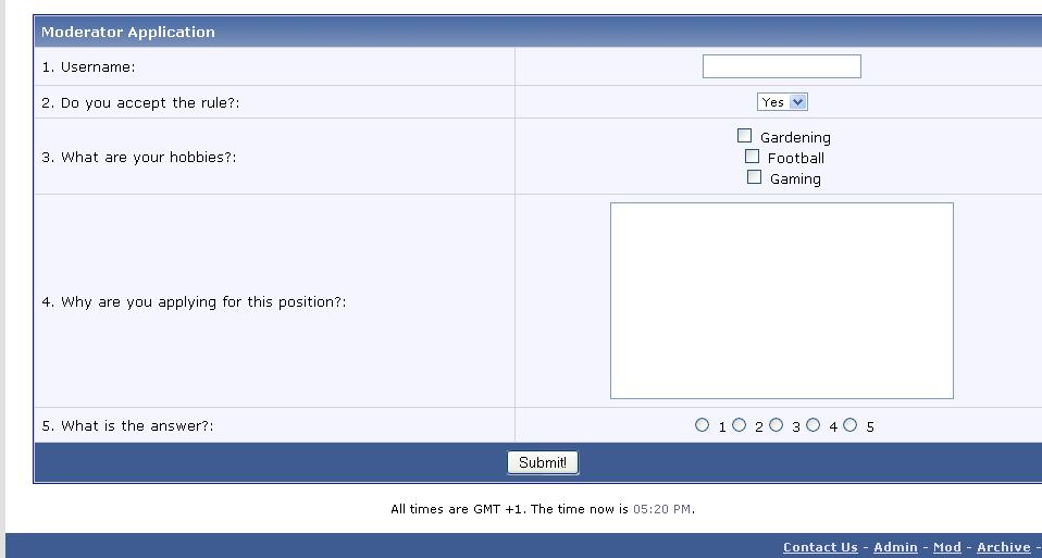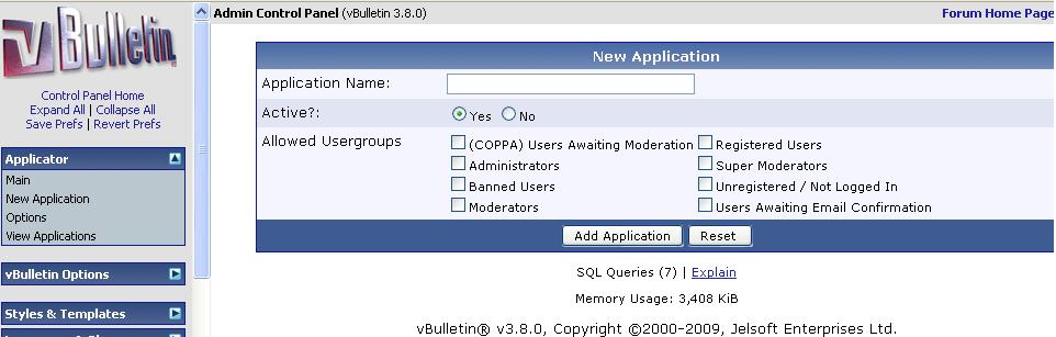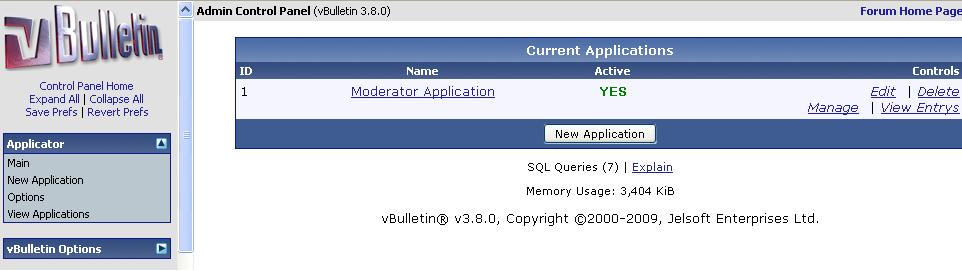 || || [BFC] Applicator || ------------------------------------------------------------------ || Author: EnIgMa1234 || Site: http://www.bluefirecreation.com || Copyright ©2009 EnIgMa1234. || This addon may not be redistributed or modified in whole or significant part. || \*===================================================== Presenting The Applicator! What is it? Ever wanted to easily add surveys or applications to your forum but didn't know how? Applicator does this for you. With Applicator you can create endless amounts of applications/surveys in just a few clicks. Features: See screenshots. How do I install? Follow the installation instructions provided .Support for this product will be provided on my site. Limit support will be offered here. Please do not PM me about this hack. Thanks!. Download