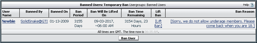 - If the underage user -to be banned- is already banned before, then his/her account will be checked, if the ban will be left before he goes to the permitted age, then his ban record will be updated to reflect the new "left ban date" which will corespond to his legal/permited age date. The ban reason will be updated also.