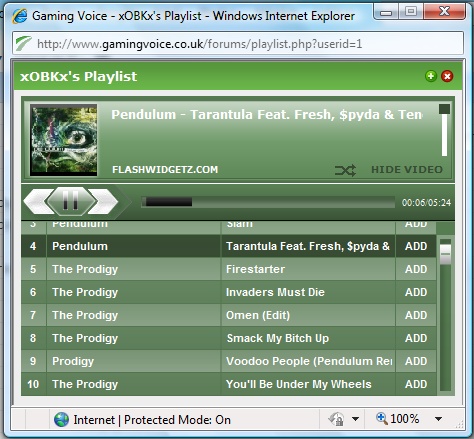 This modification provides your users with the opportunity to create and share a playlist of their favourite music, from an external source via flashwidgetz.com. View screenshots to give an example of this, it's running on my forums. [http://www.gamingvoice.co.uk/forums/general-discussion/4-how-integrate-playlist-your-profile.html] Fed up of listing your favourite artists, bands or tracks via your profile on a social network or forum community, only for others to have no idea what you're talking about? So was I! Give your users the tools they need to share their music taste with others in an interactive way, so that the music is actually available to listen to! Better still, it's done via a forum pop-up (similar to the smilies list) - no more accidentally navigating away from the page mid-song! Clever, yes? However, it does take a bit of setting up with a custom profile field and manual template edits. I make no apologies for this, I may make an "automated" version in the future - donations would help to motivate me do so.. ![]() Download
