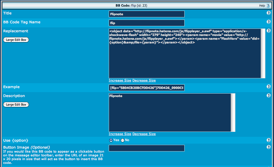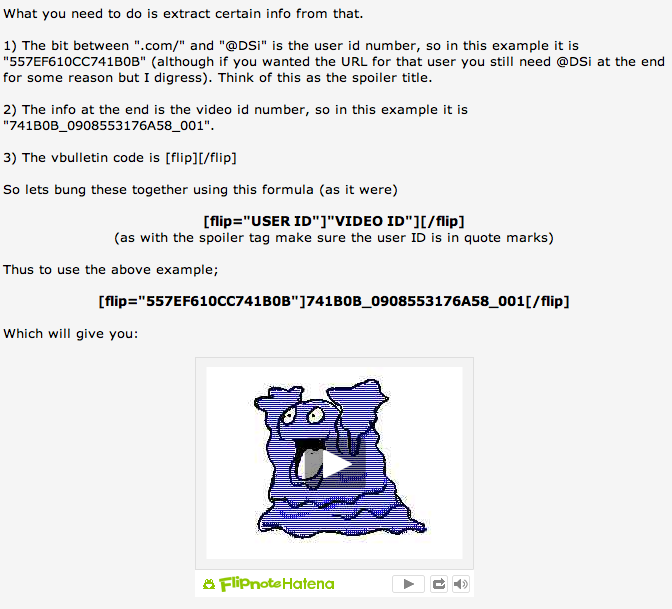 This may be a bit niche but I was recently asked to make an embedded player for http://flipnote.hatena.com/ and thought I would share if there are any other gaming sites out there who may be interested. How to Install: 1) Go to AdminCP 2) Go to Custom BB Codes 3) Click Add New BBCode 4) Fill in the following: Title: Flipnote Tag: flip Replacement Code: