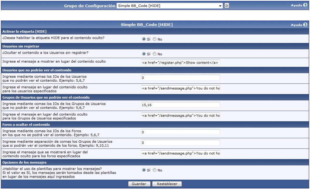 Hack developed by: Mario Torres P. Based on hide hack. http://www.construcmedia.com, http://www.elwebpoint.com This modification allows you to hide in a simple way to wrap content by label [HIDE] [/ HIDE] to unregistered users and some subscribers depending on the options you set, for it only enough to install it, give the message to replace the hidden content and ready. In version 1.0 Simple bb_code Hide, only hiding the content wrapped in the tags to unregistered users, personalize the message to be displayed. In version 1.1 Added option to control the hidden content to specific Users, User Groups and Forums in the case of choosing forums to hide the content, visitors have the option to choose which user groups can view the forums with the content hidden. In version 1.2 in addition to the above features, you can select not only for display messages to users through the Setup Options, but also through templates, so the level of customization is higher and can access vBulletin variables and use them to build complex messages. In the case of wrapping a link (URL) with the labels [HIDE] [/ HIDE] from the editor toolbar, you should remove the link to the labels (if they have any), by clicking over them and pressing the Link button, you should only have the URL link in the labels themselves and us. These options are an aid in the case of creating forums in which only a certain users can view their contents, such as the forums with downloads surcharge. With Simple Hide bb_code can choose the way how messages are displayed, you can choose to display messages from typing the vBulletin Options in the admin control panel or by editing any of the 4 templates to create this hack, but for the latter option be enabled to use Simple options Hide bb_code, templates are shown below: Simple Templates bb_code Hide=> tplh_simple_hide_no_user_message tplh_simple_hide_user_message tplh_simple_hide_usergroup_message tplh_simple_hide_notforum_message The messages that replace the hidden content, are completely customizable, so that even can be replaced by images instead of a text indication. Installation Instructions: 1 .- Import the file: product-simple-bb_code-hide-v1.2.0.xml by AdminCP-> Plugins & Products-> Manage Products. 2 .- Set the output by: AdminCP-> vBulletin Options-> Simple BB_Code [HIDE]. 3 .- Upload an icon in Spanish / English from the bb_code_Icon folder to the folder: /images/misc. 4 .- Set the button to the bb_code [HIDE] going to AdminCP-> BB Codes-> BB Code Manager-> Edit-> button image indicates the path: /images/misc/icon-en.png. Translate Spanish language product: 1 .- For the Spanish translation of this product should be imported via AdminCP language-> Languages & Phrases-> Download / Upload Languages, overwriting the Spanish language without a title and NOT as a new language (plus the phrases only of this product). 31 August 2009 Download