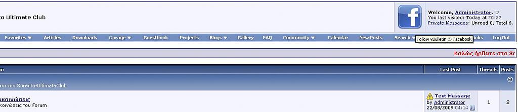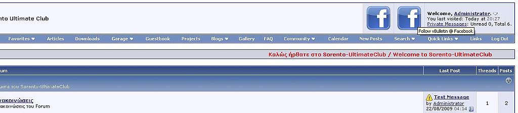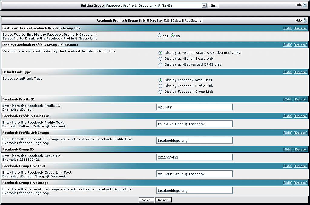 facebookprofilelinkimage facebookprofileid facebookprofilelinktext facebookgrouplinkimage facebookgroupid facebookgrouplinktext find_string add_string displaytype 5. Go to Admin Control Panel => vBulletin Options => Facebook Profile & Group Link @ NavBar and Modify your settings. Sorento-UltimateClub http://www.sorento-ultimateclub.com/ Download