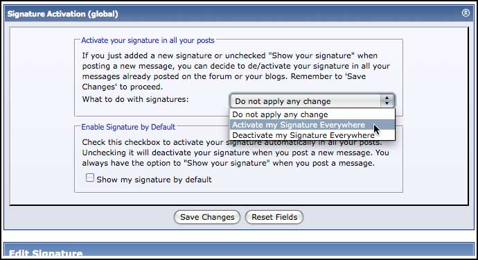 This feature will automate this process by checking all your old posts and re-activating the signature display. the choice do the opposite too, because it's a select that let you choose to alternately deactivate your siggy everywhere... So when you http://www.vbulletin.org/forum/profile.php?do=editsignature, you have a new choice: And as you see in the screenshot, you have a new checkbox to enable/disable the display of signature when you edit/create a new message... As usual, this product is without any template or file edit, so you just have to import the product, and that's it! note: if you have a major forum, like millions of posts, i suggest to avoid this hack, as it will lock the posts table when editing the signature field of each posts from a member... it may be long for a member with 10 000 posts! first released here: Nexia's Signature Activation Download
