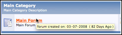 The main goal of this feature is to identify the new forums date of birth and the old forum's first post date. When you first install this product, it will create a new entry in the forum table, and will check for each existing forum's first post date to be entered in the database. By then, each time you create a new forum, a timestamp will be added. (we can not track the original date of creation of the existing forums, so we use the oldest post/thread created in them to tag these forums) So with this first version, what you can do is verify the date of creation/birth of each of your forums. This is very useful when you have tons of forums and they are created in different moments. So if you want to know when forum X was created compared to forum Y, you simply have to hover on its title. This is a first stage of development for this tool, so maybe the only thing you can do with it is to verify if a forum worth to be kept after X months... but i plan adding some features to it, like global stats to compare the activity of all the forums, but they would not require more database edits than required... This product is self installed, there is no template edit, and you can deactivate it or uninstall it without breaking anything on your forum. It is opened to any coder to add features to this addon. something that could be useful is statistics based on lifespan vs other forums... Download