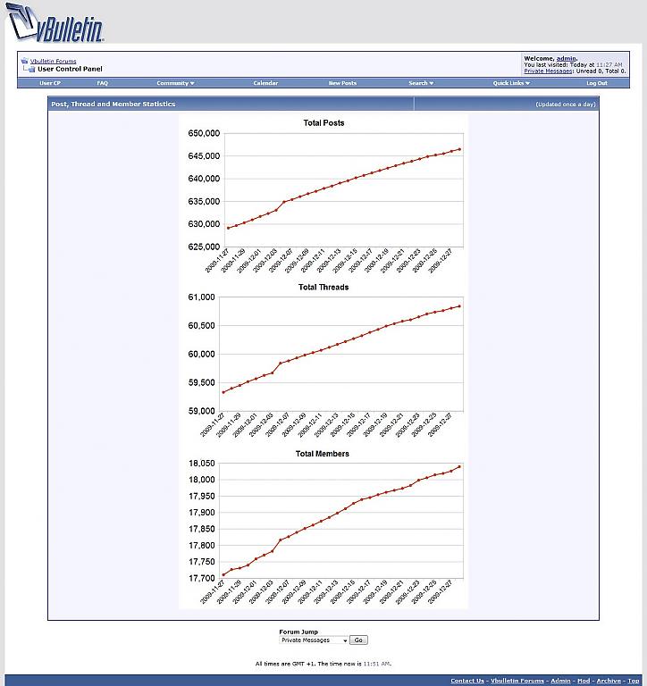 I am always amazed to see how very linearly my forum grows. I believe that most online forum show such a linear growth pattern. If you like this product, let me know the url of your stats page. I would love to see the growth of other forums. :-) This small addon uses the Google Visualization API to show some basic statistics of your vbulletin forum. The total number of posts, threads and members is queried daily with a scheduled task. Installation is straight-forward and does not include any template edits. --- Installation Instructions: *** Backing up your database before you start the installation is a good idea, as the product creates a new database table... 1.) Create a scheduled task with these settings: Varname: xyz_stats Title: XYZ Forum Statistics Description: Query forum statistics and write them into special database. (No Log Phrase) Day of Week: * Day of Month: * Hour: 9 Minute: 0 - - - - - Active: Yes Log Entries: No Filename: ./includes/cron/xyz_stats.php Product: xyz_stats 2.) Upload the files in the upload folder to your forum directory. 3.) Upload the product xml in the product manager. 4.) Visit <form directory>/stats.php 5.) Wait and let the daily cron job gather data. ![]() Download