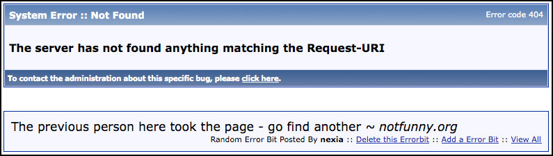 Do you think that you could be more than happy to even offer your visitors the capability to create new error messages for the fun of it? The error bits is just that. Error Page for more than just the 404... 400 to 503 errors are managed thru the system, displaying the correct error message and some details if possible. And in addition, a "citation system" that let your members enter some new funny quote... We can even add the search box for the entire forum in the footer of the main error page, for easier browsing... so here is the AdminCP Setting page: And the adminCP for Managing the quotes from members: you can see on this screenshot that the Admin Only have a link to delete the quote, and the Members Only can see the link to Add a new or browse the list... ... To make it installed, there is a .htaccess file to install or edit your existing one, one file to upload and the product file to import. The system comes with no random quote in the database at first. This is to let your members add their own things. But if you want to start with some quotes related to Error 404, i added a bank of 656 quotes from the dead site "notfunny.org"... (with accreditation!) Download