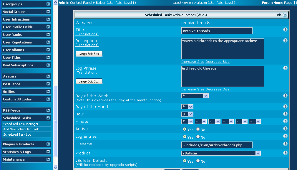 This is just a php script; it does not integrate into the adminCP and you will need to manually create the scheduled task. Likewise, all settings are changed within the php file, so in its current form only the site's coder can modify this script. The default script does not archive stickied threads, however you can easily modify the script to do so if you wish. To use this script, upload the php file into /inclues/cron and create a scheduled task pointing to the uploaded file. **The PHP script will need to be configured before use** v1.01 Changed the switch statement to an array, halving the amount of configuration required. Download