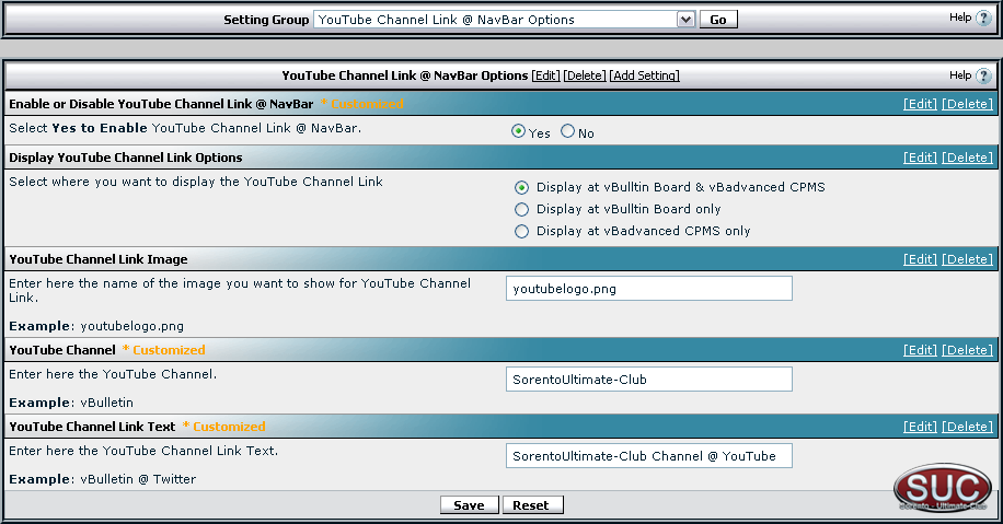 <!-- / PAGENAV YOUTUBECHANNELLINK --> 5. Only for vBadvanced Users Go to Admin CP => vBa CMPS => Default Settings => Main Options => Portal Output Global Variables and add the variables: youtube_channel_link_image_name youtube_channel_link_text youtube_channel string_fnd string_add string_rpl displaytype displayplace Sorento-UltimateClub http://www.sorento-ultimateclub.com/ Download