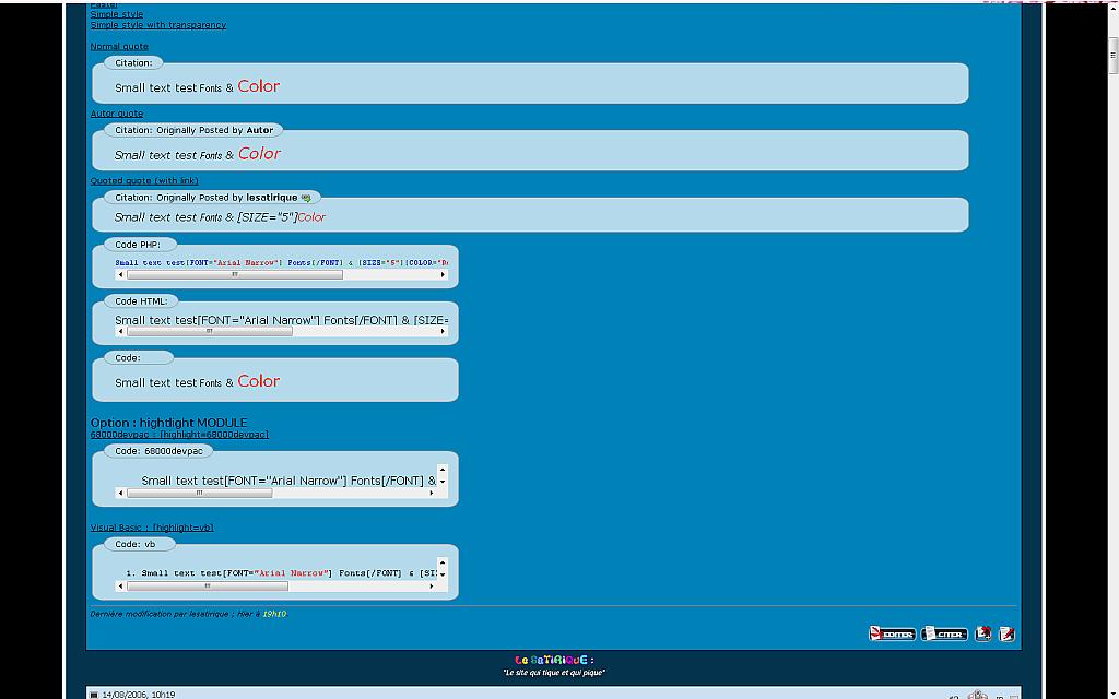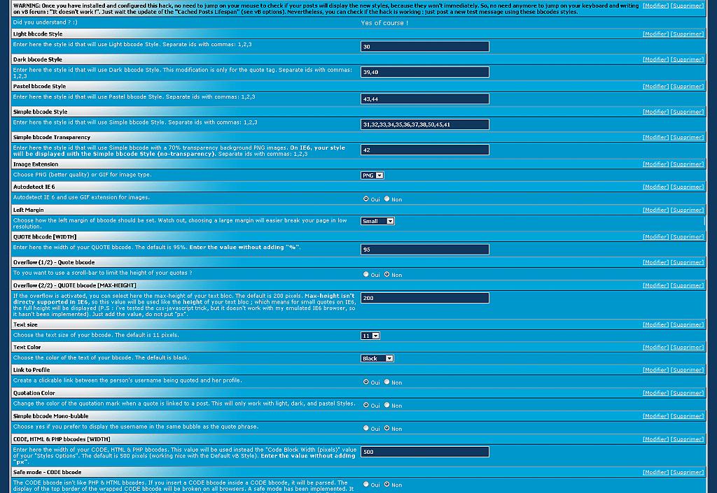 -Warning-Once you have installed and configured this hack, no need to jump on your mouse to check if your posts will display the new styles, because they won't immediately. So, no need any more to jump on your keyboard and writing on vB forum : "It doesn't work !". Just wait the update of the "Cached Posts Lifespan" (see vB options). Nevertheless, you can check if the hack is working : just post a new test message using these bbcodes styles.