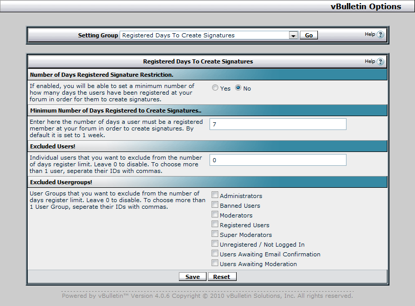 After installing the hack, go to Settings-Options->Registered Days To Create Signatures. There you can enable and disable the hack. You can also enter the minimum number of days a user must be a register member in order to create signatures. You can also choose which User Groups and/or Individual users and/or forums will be excluded from the number of days register limit. Download