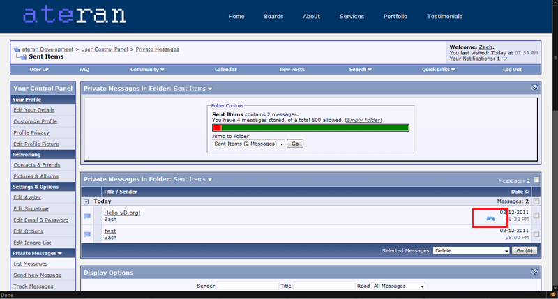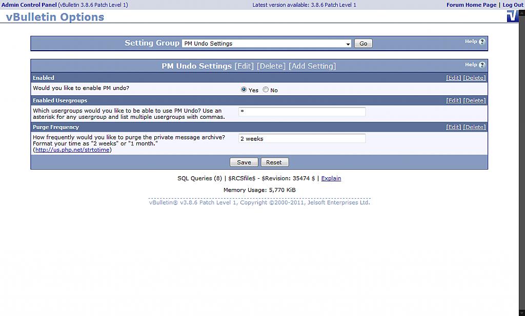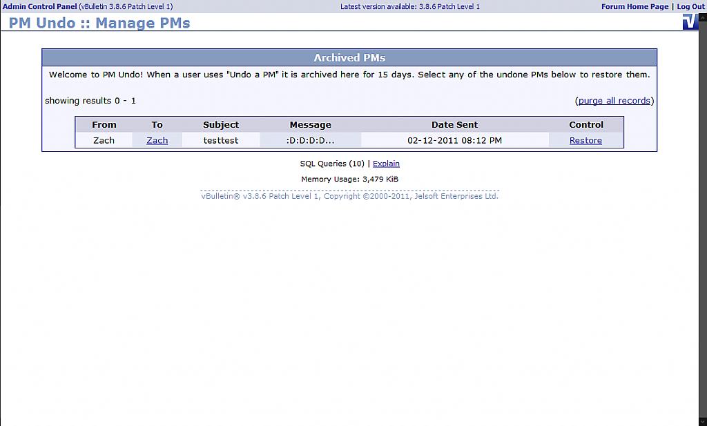 PM Undo designed by the guy at http://ateran.org/ (Professional vB Dev) Ever sat down to right an email to your boss about how you hate the company, your life, your kids, his kids, his incompetence, the world, your keyboard... the list goes on. Then you hit Send? Oh shi- darn, I just sent it! Now imagine doing the same thing in a PM on your boards. There's no way out. Or is there? Introducing PM Undo; you can now easily undo any PM in your Sent Items folder as long as the recipient(s) hasn't viewed it yet. Just click the little blue button by the time! This has been designed for vB 3.8.x but has worked on 3.7.x. I haven't tested any lower than that. Features: * Undo any PM you have sent in the past as long as it hasn't been viewed yet * Supports multiple recipients * Includes a "PM Archive" where any administrator can view all PMs that have been "undone" and can revert/restore them if necessary (breaks rules, etc.) * Automatic pruning of the archive mentioned previously * Lightweight, uses as few queries as possible * Made in the USA! ![]() Changelog: 1.1 - Fixed critical bug when a user had e-mail notification for private messages enabled 1.0 - Initial Release and remember... ![]() MARK AS INSTALLED Download