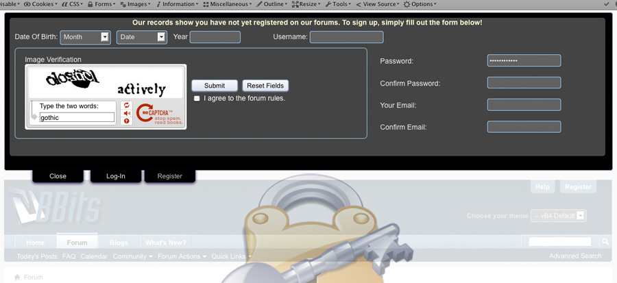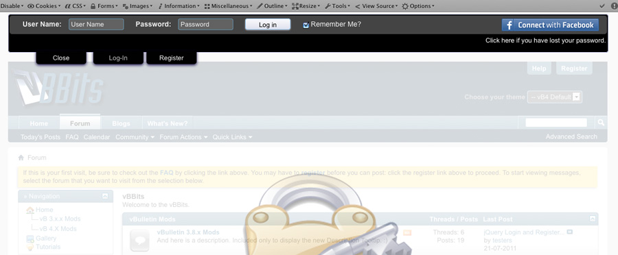 This mod will add a tabbed drop-down slider for both 'Log-In' and 'Register' dialogues based on the http://flowplayer.org/tools/index.html. UPGRADE: This release only addresses a couple of compatibility issues. It will now play more friendly with other jQuery scripts. The registration Human Verification component supports the 'Image Verification', 'Question & Answer' and the 'reCAPTCHA' modules, but NOT third party ones. Please remember that if you have more than one mod that uses jQuery, they could conflict with each other. You can see a http://www.vbbits.com/forum.php?styleid=11 (You need to select the 'Grey' theme from the drop-down 'Choose your theme..') The next upgrade will include alternative styles amongst other things. To Upgrade from Beta 1: All you need to do is re-import the product file, allowing overwrite. Installation: Upload the content of the 'Upload' folder to your forum root, retaining directory structure. If you already have TMS installed, the installation is a breeze, simply import the product file 'product-jqt_sliding_login.xml' in your AdminCP/Plugins & Products/Manage Products/ If you do not have TMS then in addition to importing the product file you will need to carry out the template edits found in the 'Template Edits.html' document. There aren't too many. Configure the mod in AdminCP/Settings/Options/jQt Sliding Login All updates/future releases and support are now only available at jqt-suite.co.uk Download