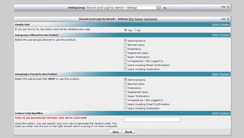 Like I said, you have the ability to force usergroups to use this mod. If a user is in a usergroup you have forced, then they will get an error when they view the forumhome if they have't enabled this mod on their account. As well as that, there is an option for Admin's to specify their own custom code algorithm. This will allow Admin's to choose how the random second code is generated, if they so wish. Screenshots below. Please mark as installed for more support. Changelog: 1.1.0 Added hooks to allow further development Removed unused plugin 1.0.1 Fixed mutiple SQL Injection vulnerabilities. 1.0 Initial Release Download