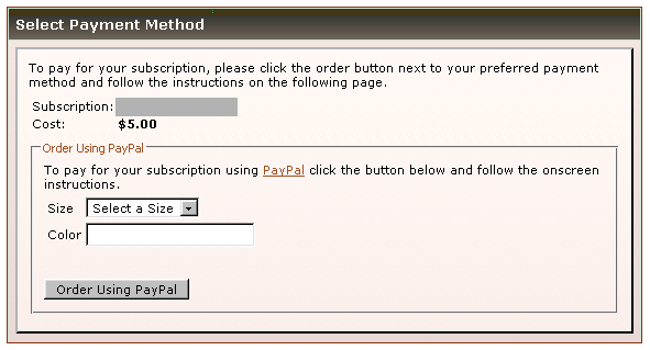 This is a small mod that allows you to add options, such as shirt size and/or shirt color, etcetera, to PayPal payments. Install as a product and then edit the paypal_payment_optionbit template to set your options. It should be easy enough to extend to other payment processors.